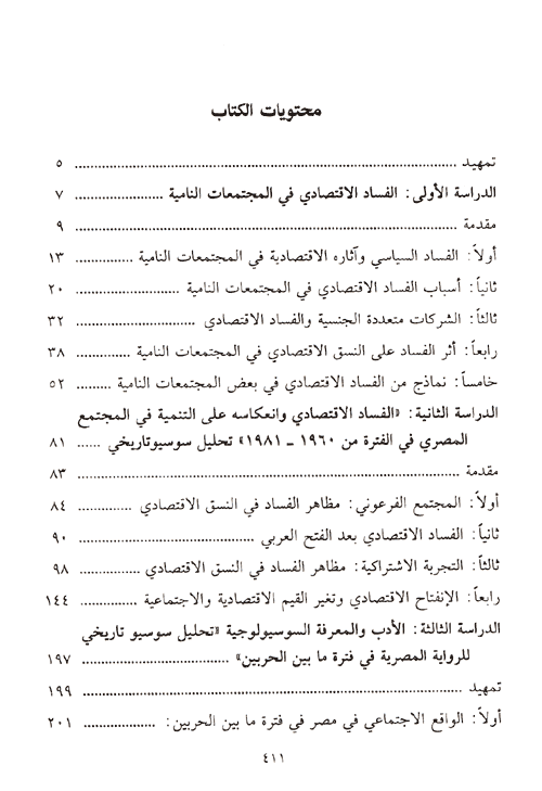 ويضم هذا المؤلف ست دراسات سوسيولوجية تعبر عن التطور في مجال الدراسة والبحث من علم الاجتماع، الأولى عن "الفساد الاقتصادي من المجتمعات النامية" وآثاره السلبية على خطط التنمية في هذه المجتمعات. ولا شك أن الفساد الاقتصادي له جذوره السياسية في كثير من المجتمعات النامية. ولقد تناولت هذه الدراسة أسباب هذا الفساد وأشكاله المختلفة، وآثاره المتنوعة على البناء الاقتصادي بصفة خاصة والبناء الاجتماعي بصفة عامة، فضلاً على تناول ظاهرة الشركات متعددة الجنسية وعلاقتها بالفساد الاقتصادي في المجتمعات النامية، وعرضت الدراسة أيضاً نماذج من الفساد الاقتصادي في بعض المجتمعات النامية.