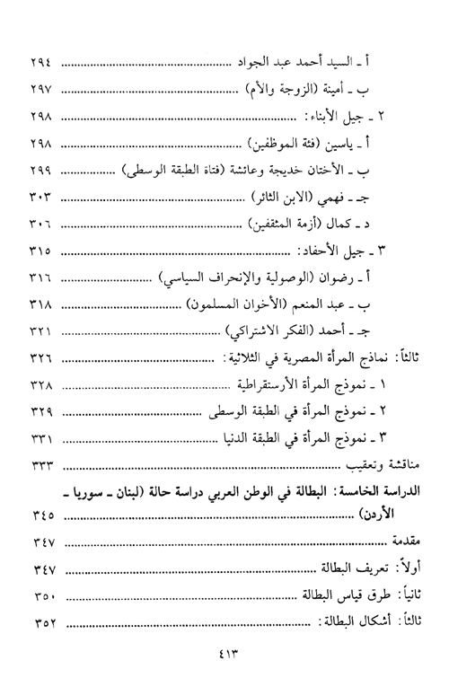 أما الدراسة الرابعة فقد تناولت جانباً تطبيقياً في مجال سوسيولوجيا الأدب وهي "تحليل سوسيولوجي لثلاثية نجيب محفوظ، ولقد تناول التحليل الشخصيات الأساسية للثلاثية ودلالاتها الاجتماعية وارتباطها بالزمان والمكان. والدراسة الخامسة عن آفة المجتمعات العربية المعاصرة وهي ؟طاهرة البطالة" حيث تناولت هذه الدراسة أسباب الظاهرة وأشكالها المختلفة مع الإشارة إلى نماذج واقعية للبطالة في بعض المجتمعات العربية كالمجتمع اللبناني والسوري والأردني.