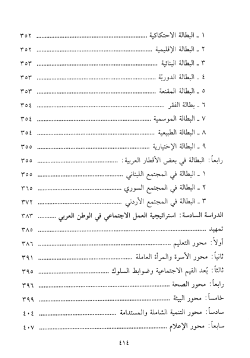 أما الدراسة السادسة والأخيرة فهي عبارة عن تصور لاستراتيجية للعمل الاجتماعي في الوطن العربي، ولقد تضمنت هذه الاستراتيجية عدة محاور متنوعة كمحور التعليم، والأسرة والصحة، والقيم، والتنمية المستدامة والشاملة، والبيئة وغيرها من المحاور التي تشكل فيما بينها ما يعرف بالعمل الاجتماعي. إقرأ المزيد