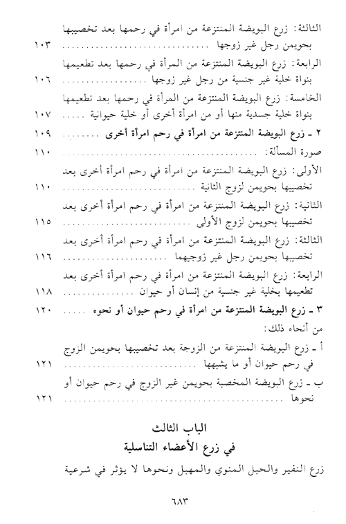 أما الفصل الثالث فخصص لبيان الأحكام التي تترتب على استخدام تلك الوسائل والآثار المعني بها هذا البحث تدور حول عدة موضوعات هي: العدّة، نفقة الحامل، الانتساب، التبنّي، الإرث والرضاع والنكاح، الإجهاض.