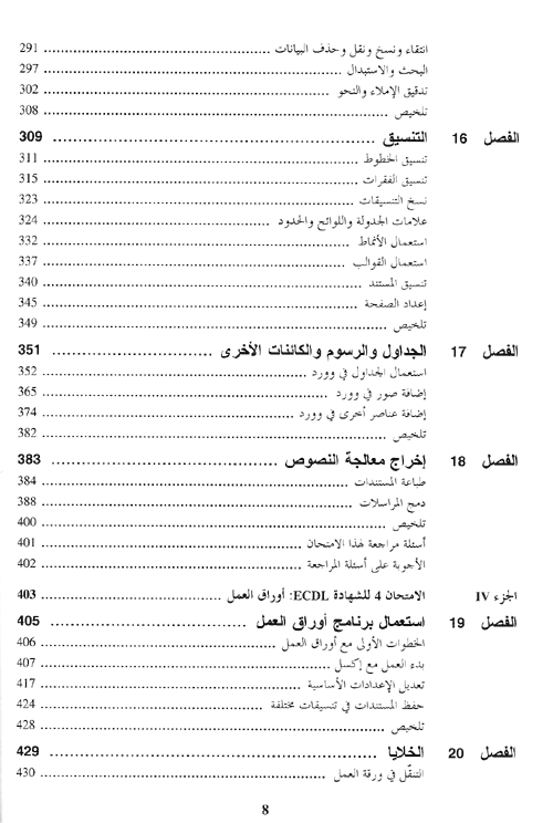 أوراق العمل: العمل مع الخلايا والحقول والأعمدة، التلاعب بأوراق العمل، استعمال الصيغ والدالات تنسيق الخلايا، إنشاء تخطيطات ومخططات.