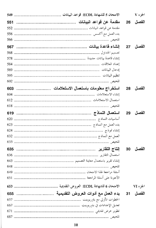 قواعد البيانات: استعمال الجداول والسجلات والحقول، العمل مع النماذج، استخراج البيانات، إنشاء تقرير وتعديلها.