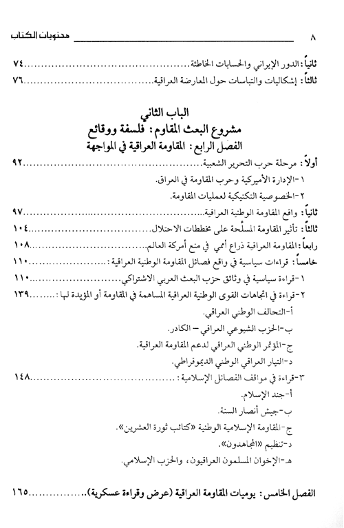 وتجدر الإشارة إلى أن المؤلف كان قد عمد إلى قراءة عسكرية للعمليات العسكرية للمقاومة العراقية، من خلال تفريغ المعلومات في جداول إحصائية، إلا أنه لما وجد أن متابعة المسألة الإحصائية لا تغير في قراءة المستقبل كثيراً، ولما كانت العلميات ذات زخم وأخذت تتحول إلى طفرات نوعية، توقف عن العمل الإحصائي، لأن ما حصل خلال شهور قليلة يغطي مرحلة في غاية الأهمية، دفعت إلى الاستنتاج أن المقاومة العراقية قد ثبتت أقدامها ولا خوف عليها من التقهقر والتراجع.