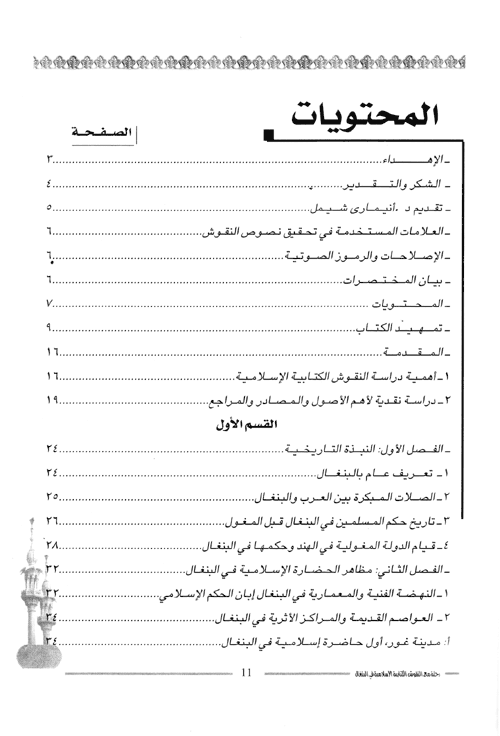 ثم خصص القسم الأول للتعريف بالبنغال والصلات المبكرة بين العرب والبنغال تاريخ حكم المسلمين فيها قبل الحكم المغولي وبعده. وفي الفصل الثاني بين المظاهر المختلفة للحضارة الإسلامية في البنغال، فتعرض لتاريخ الفن الإسلامي، والنهضة المعمارية في ذلك المنطقة، وكذلك تحدث عن أهم العواصم والمراكز الحضارية الأثرية في البنغال التي كان من أهمها مدينة غور ويندوه ودهاكا.