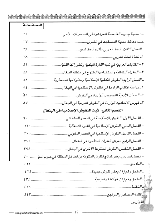 أما الفصل الثالث فقد أفرده للحديث عن نشأة الخط العربي وأثره الحضاري. فناقش فيه كيفية استخدام الخط العربي في شبه القارة الهندية، وشيوعه وانتشاره، وكذلك ناقش الأنواع المختلفة للخطوط العربية هناك، أما في الفصل الرابع فقد تعرض للنقوش الكتابية الإسلامية ومدلولاتها الحضارية، حيث تناول تقديم الأسلوب الأدبي للنصوص الواردة في النقوش البنغالية التي عثر عليها حتى يومنا هذا، كما أفرد عنوناً رئيسياً لدراسة الألقاب المختلفة التي وردت في نصوص تلك النقوش، وكذلك وضع فهرساً للأحاديث النبوية التي وردت في تلك النقوش، أما القسم الثاني فهو القسم الرئيسي للكتاب، حيث إنه يشمل بثبت النقوش الإسلامية في البنغال موزعة على ستة فصول. إقرأ المزيد