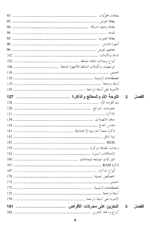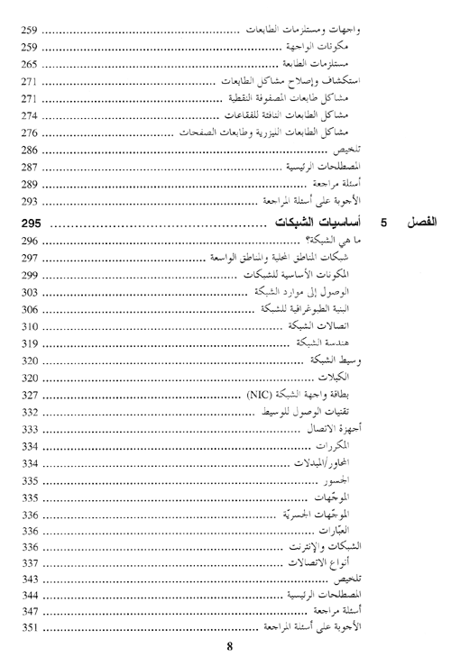 أما الفصل الخامس فيركز على المفاهيم الأساسية لعمل الشبكات بما في ذلك الأساليب المتبعة لإرسال المعلومات والأدوات المستخدمة لهذا الغرض. بينما يغطي الفصل السادس المهارات اللازمة لتجميع الكمبيوتر الخاص من أجزاء مختارة بعناية. أما الفصل السابع فيعرض وبشكل مفصل للكمبيوترات المحمولة العادية (Laptops) ويناقش الأساليب المتبعة لخدمتها.