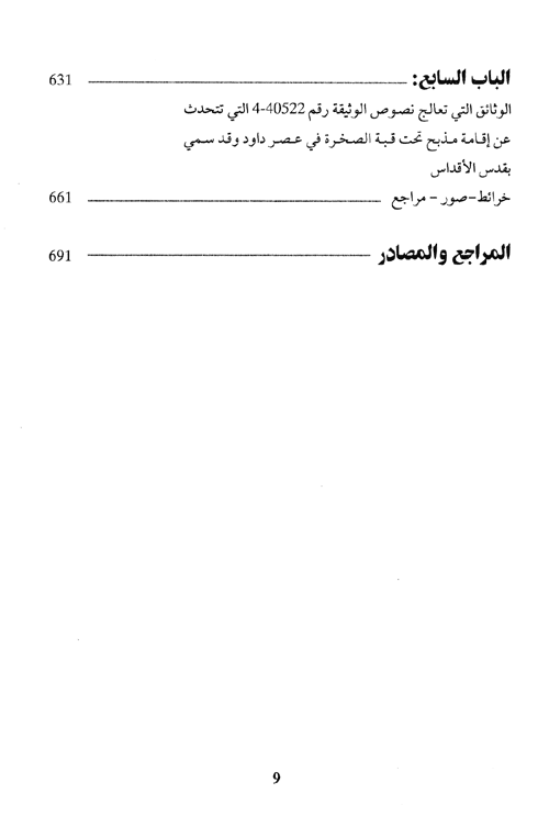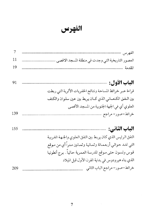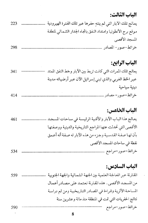 في هذا الكتاب تمّ توصيف لجملة من الحفريات الأثرية التي أجراها اليهود بهدف العثور على بقايا الهيكل المظنون ...في وجوده تحت الصخرة المشرفة، والمبتناة على أنقاض الهيكل. في أبواب الكتاب الثمانية نجد استقراء تفصيلياً لخرائط وحفريات تمتد لعقود طويلة من الزمن. ربطت النفق الكنعاني الذي كان يربط بدوره بين عين سلوان والكتف العلوي من المسجد الأقصى. ثم دراسة النفق الرئيسي الذي يربط النفق الممتد من موقع قوس ولسون حتى موقع المدرسة العمرية حالياً.