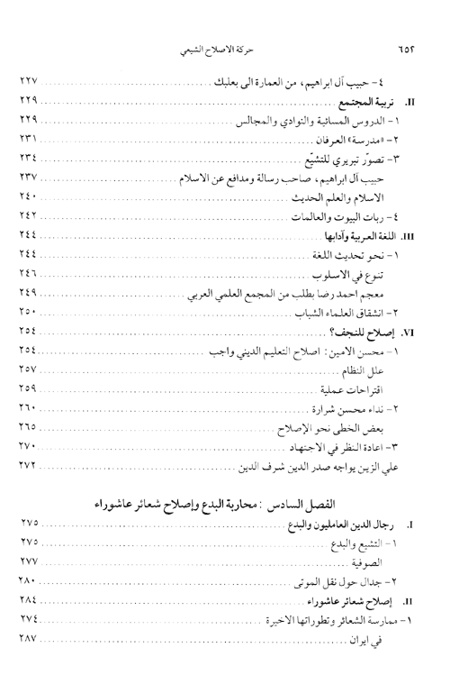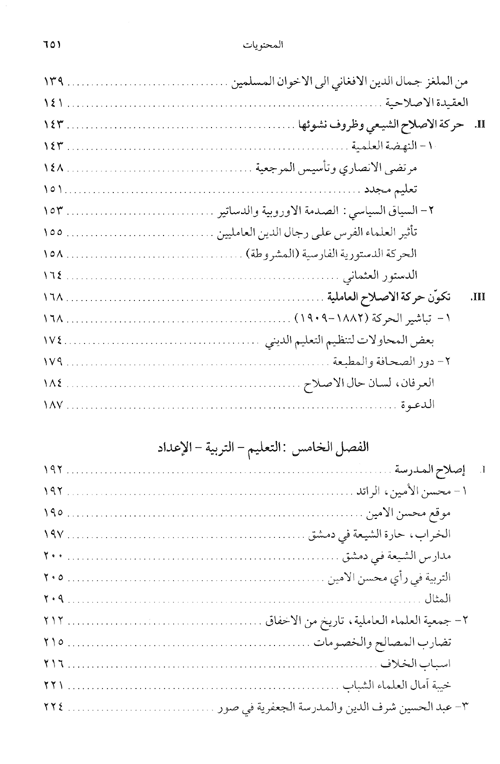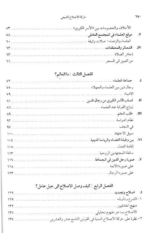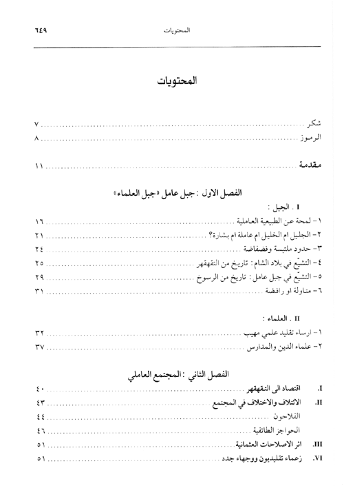 وقد كرّس هذا الكتاب لحركة الإصلاح الشيعي في جبل عامل في نهاية الدولة العثمانية وفي أثناء تكوين الدولة اللبنانية (1880-1943). وكان اختيار هذه المنطقة طبيعياً لكونها منبتاً للعلماء الإماميين. والرجال الذين يستعيد هذا الكتاب سيرهم الفكرية هم من العلماء والأدباء. وقد توصلت المؤلفة من تحليل آثارهم وأعمالهم إلى استعادة بناء البيئة التي انتموا إليها، وإلى كشف الصلات القائمة فيما بينهم واستراتيجيات المصاهرة، بالإضافة إلى علاقاتهم بغيرهم من الفاعلين الاجتماعين بتفصيل يصل إلى دقائق الحياة اليومية.