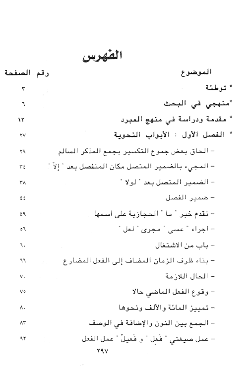 وبالعودة لمضمون بحثه هذا نجد أنه قد قسمه إلى مقدمة وفصلين وخاتمة، ثم ألحق بها بعض الفهارس. وقد ذكر في المقدمة منهجه في البحث والطريقة التي جمع بها مسائل هذه الرسالة، وعرض للحديث عن المبرد وظاهرة رد الشواهد بشكل عام، كما عرض لبعض الجوانب من شخصية المبرد ومنهجه، لوضع آرائه في موقعها الحقيقي دون دفاع أو تهجم قائم على العصبية. أما الفصلان فقد عالج في الأول منهما القضايا النحوية بالمعنى الخاص للنحو وهي جل القضايا، وعالج في الثاني القضايا الصرفية والصوتية واللغوية "بمعناها الخاص" ثم ذكر خاتمة ضمنتها نتائج البحث وخلاصته.