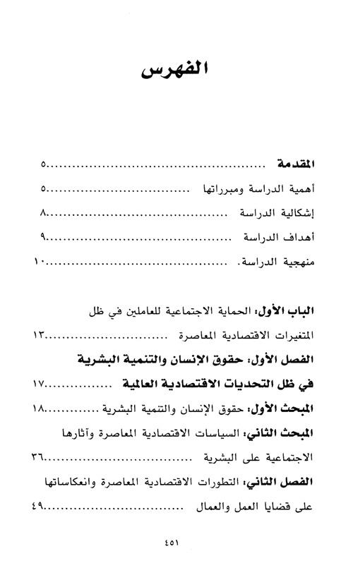 وعليه فقد جاءت هذه الدراسة مقسمة إلى ثلاثة أبواب على النحو التالي: الأول ويتعلق بالحماية الاجتماعية للعاملين في ظل المتغيرات الاقتصادية المعاصرة، حيث سيتم تقسيمه إلى ثلاثة فصول، الأول، يستعرض الجهود الدولية التي بذلت في مجال حقوق الإنسان، وخاصة التي أسفرت عن ربط مفهوم التنمية البشرية بتلك الحقوق، باعتبار ذلك، المرتكز الأساسي الذي تنطلق منه التنمية الاجتماعية، وتحقيق الحماية الاجتماعية للطبقات العاملة، واستعراض الآثار التي خلفتها السياسات الاقتصادية المعاصرة على البشرية بشكل عام.