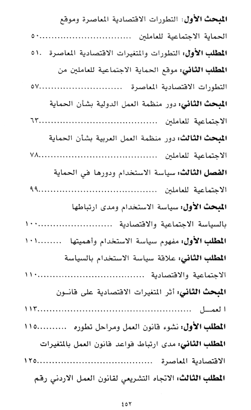 الثاني ويتعلق بالتطورات الاقتصادية المعاصرة، وانعكاساتها على قضايا العمل والعمال بصفة عامة، ابتداء من المراحل الأولى لاتفاقية "الجات" وانتهاءً بظهور منظمة التجارة العالمية وتفرعاتها المختلفة، مع الإشارة على الدور الذي تلعبه منظمتا العمل الدولية وتفرعاتها المختلفة، مع الإشارة على الدور الذي تلعبه منظمتا العمل الدولية والعربية في هذا المجال. أما الفصل الثالث، فيتناول سياسة الاستخدام وتحديد المرتكزات الأساسية التي يجب أن تقوم عليها هذه السياسة، مع الإشارة على الاتجاه التشريعي لقانون العمل الأردني رقم (8) لسنة 1996 بشأنها بوصفه القانون الأحداث صدوراً على المستوى العربي، كونه صدر في أعقاب تبني العديد من السياسات الاقتصادية المعاصرة وفي مقدمتها سياسة الخصخصة.