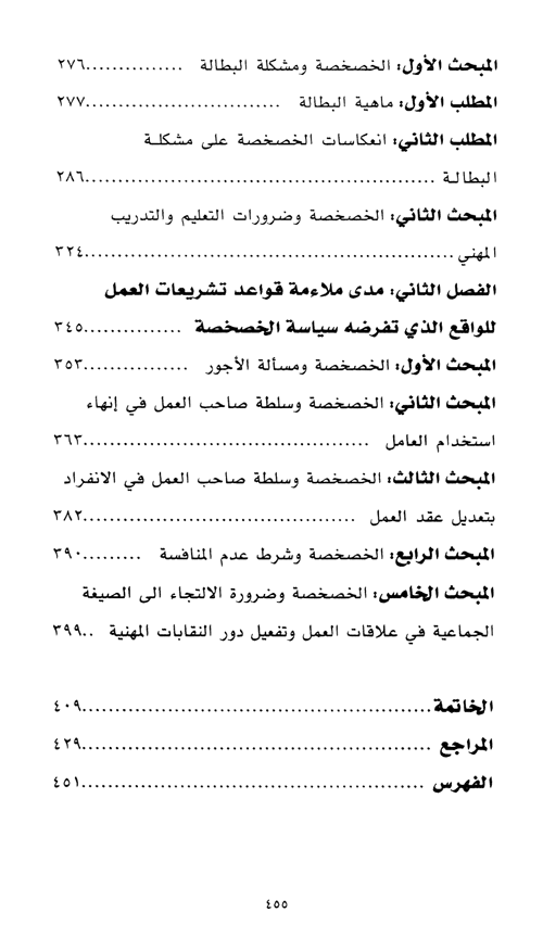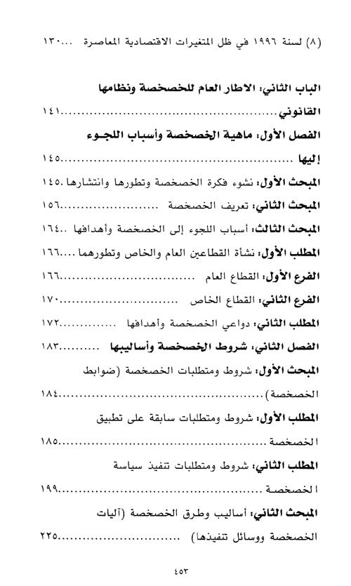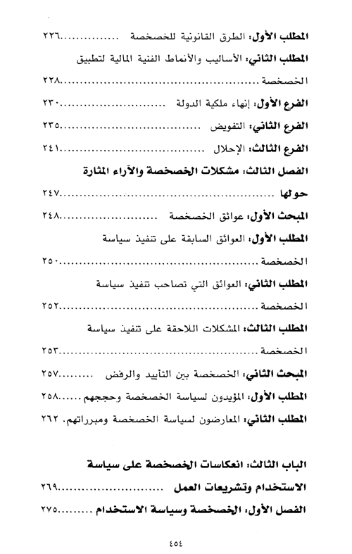 أما الثاني تم تقسيمه إلى ثلاثة فصول الأول لتحدي ماهية الخصخصة وأسباب اللجوء إليها، الثاني للتعريف على شروط الخصخصة وأساليبها، أما الثالث فخصص للتعريف على مشكلات الخصخصة والآراء المثارة حولها. أما الباب الثالث ويتعلق بانعكاسات الخصخصة على سياسة الاستخدام وتشريعات العمل، حيث سيتم تقسميه إلى فصلين، يتناول أولهما الخصخصة وسياسة الاستخدام أما الثاني فسيخصص للتعريف على مدى ملاءمة قواعد تشريعات العمل للواقع الذي تفرضه سياسة الخصخصة. إقرأ المزيد