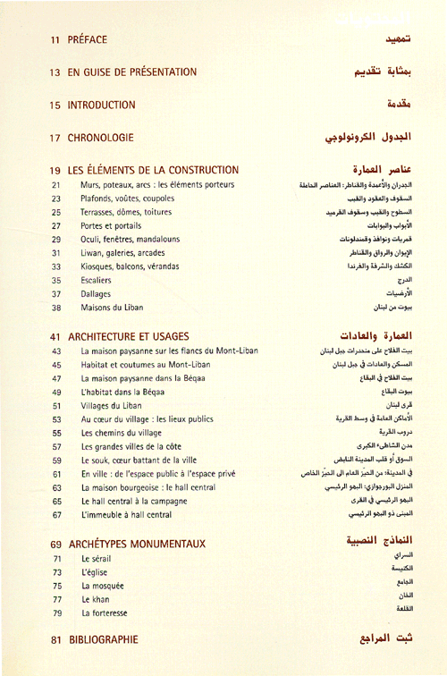 وهذان النمطان من العيش غالباً ما يجتمعان في مظهرهما المعماري، من خلال تقنية في البناء تقوم على اعتماد الحجر المقصوب، كما يجتمعان أيضاً في تشابه العناصر الهندسية وطريقة استعمال بعض الفضاءات: الحوش، الرواق أو الإيوان، ويلتقيان أخيراً في الطراز المعماري المعروف بـ"البيت ذو البهو المركزي" والذي يعود إلى القرن التاسع عشر، وهو طراز مديني بامتياز انتشر في القرى. في سياق اندماجها في إطارها الإقليمي، من خلال اعتماد الطراز الشرقي في العمارة، حافظت العمارة في لبنان على خصوصياتها بفضل ميزات لبنان الجغرافية وتعددية شعبه المنفتح على شعوب البحر المتوسط. سوف نعرض، في ثلاثة أبواب متكاملة، هذه الخصوصية التي طالما شكلت حافزاً للوحدة على جميع الأصعدة.