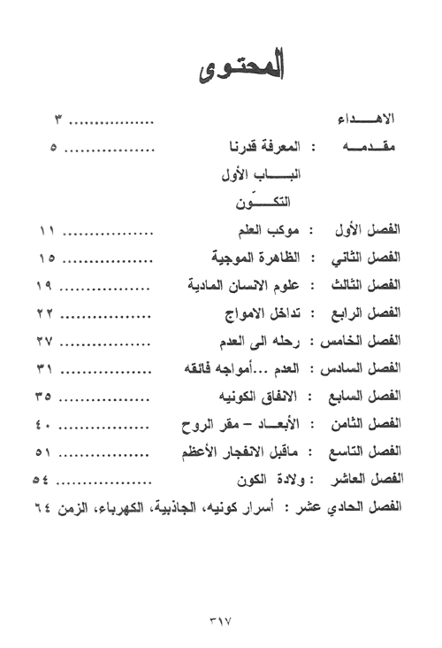 نبذة الناشر:يقدم هذا المؤلف محاولة علمية بأسلوب فكري تأملي لتفسير: طبيعة المادة والتي أمكن من خلالها معرفة سر الزمن والكهرباء والمغناطيسية والجاذبية الثقالية. وتفسير طبيعة الروح وارتباطها بالعضوية الحية مما مكن من كشف العديد من أسرارها, طاقاتها, وأماكن وجودها وأنواعها وأطيافها ومن ثم مناقشة دورها في الأحلام وتفسيرها, التنبؤ, الدعاء والقدر, ...الإيحاء, الحب, والجنس, الحسد والسحر, الموت وما بعده, التقمص الروحي, استحضار الأرواح, الحاسة السادسة, التخاطر, وقراءة الأفكار, الرؤية عن بعد, القوى الخفية عند الإنسان, الإستنساخ والروح, والروح عند القيامة, وأخيراً محاولة التقريب العلمي لبعض المعجزات وهبوط آدم وحواء للأرض وتفسير عدم رؤيتنا للجن وكشف سر مثلث برمودا وسر بصمة اليد, مع اختبار لطبيعة الروح خيرة أم شريرة. إقرأ المزيد