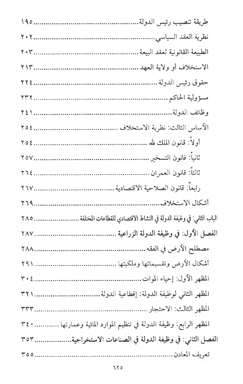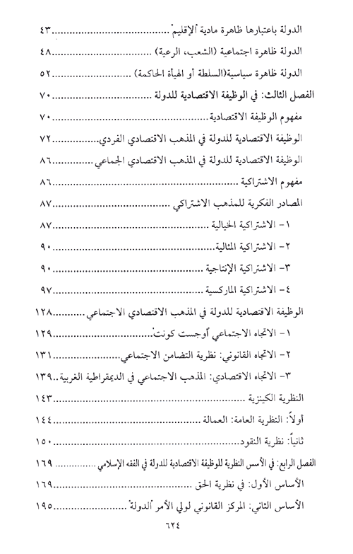 أما الفصل الرابع: فقد خصص لبحث وظيفة الدولة في سد الحاجات وبلوغ حد الكفاية وقد قسم إلى مبحثين: المبحث الأول: في مفهوم الحاجة والكفاية وما يؤسسانه للدولة من دور. المبحث الثاني: في سد الحاجات وبلوغ حد الكفاية.