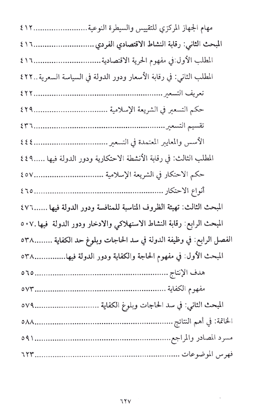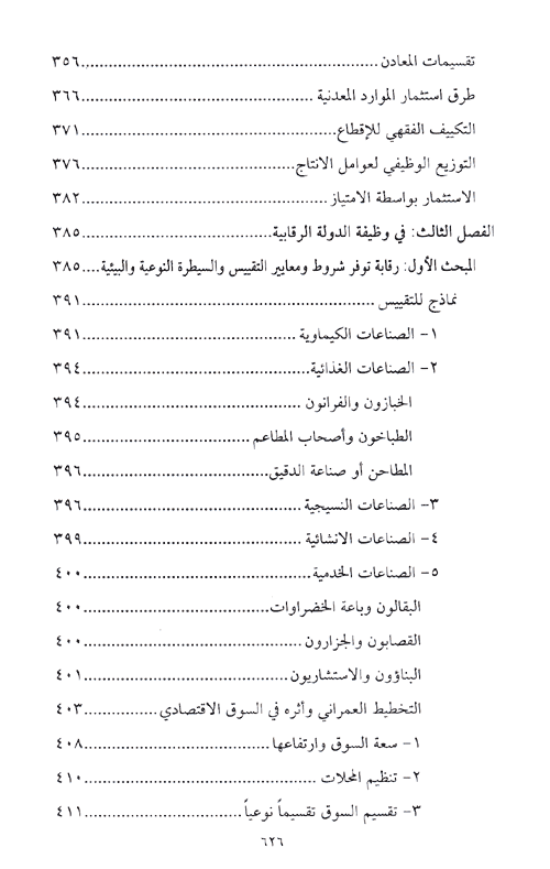 الفصل الثالث: في وظيفة الدولة الرقابية، وقد قسمته إلى أربعة مباحث: المبحث الأول: رقابة توفر شروط ومعايير التقييس والسيطرة النوعية والبيئية. المبحث الثاني: رقابة النشاط الاقتصادي الفردي ويشتمل على ثلاثة مطالب: المطلب الأول: في مفهوم الحرية الاقتصادية. المطلب الثاني: في رقابة الأسعار ودور الدولة في السياسة السعرية. المطلب الثالث: في رقابة الأنشطة الاحتكارية، ودور الدولة فيها. المبحث الثالث: تهيئة الظروف المناسبة للمنافسة ودور الدولة فيها. المبحث الرابع: رقابة النشاط الاستهلاكي، والادخار والاكتناز.