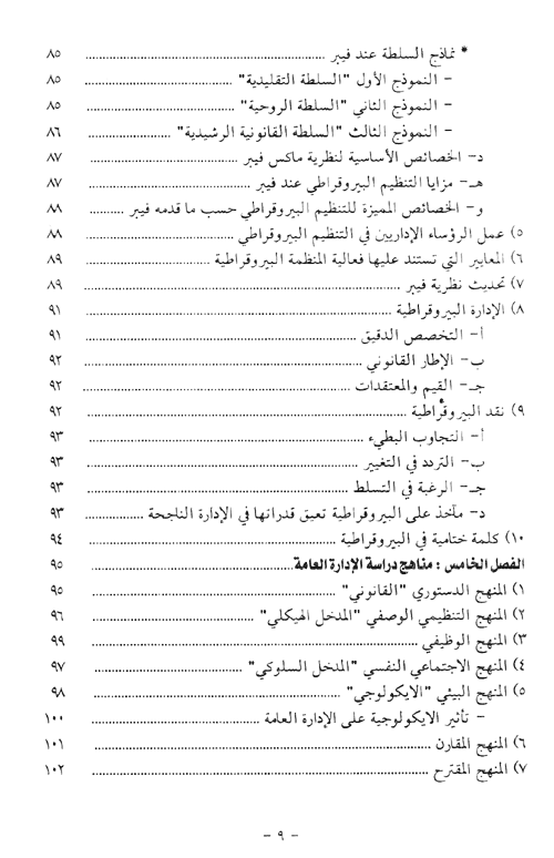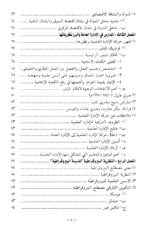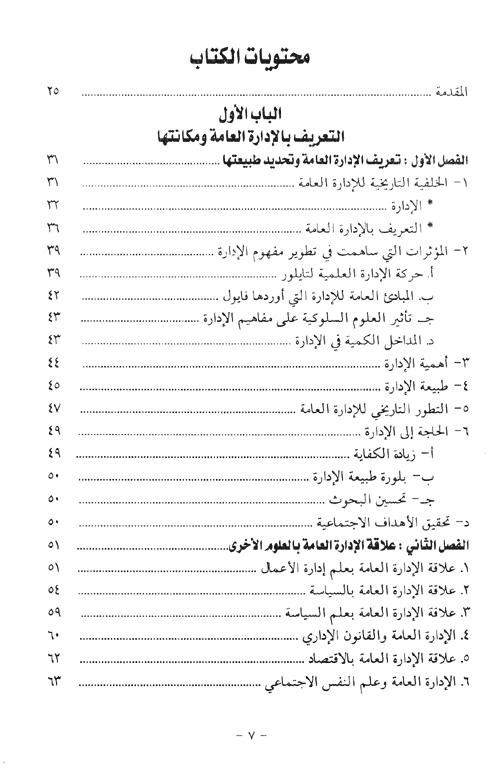 أما الفصل الثالث فقد انصب على مدارس الإدارة العامة وأبرز نظرياتها، بينما تطرق الفصل الرابع إلى النظرية البيروقراطية ودورها في التراث الإداري.