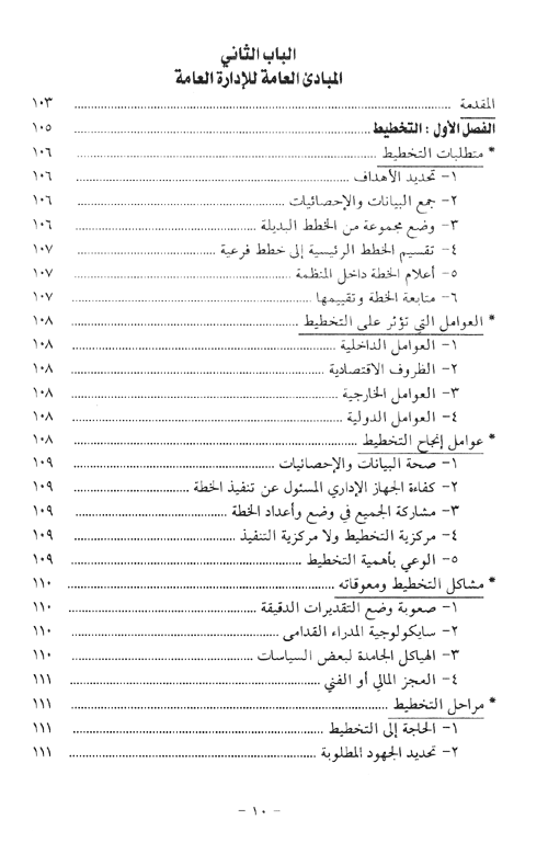 في الباب الثاني تم استيعاب وبحث "المبادئ العامة" للإدارة العامة ووظائفها، في الفصل الأول منه درس التخطيط، وفي الفصل الثاني انصب الاهتمام على التنظيم ودوره المتميز في الإدارة العامة.