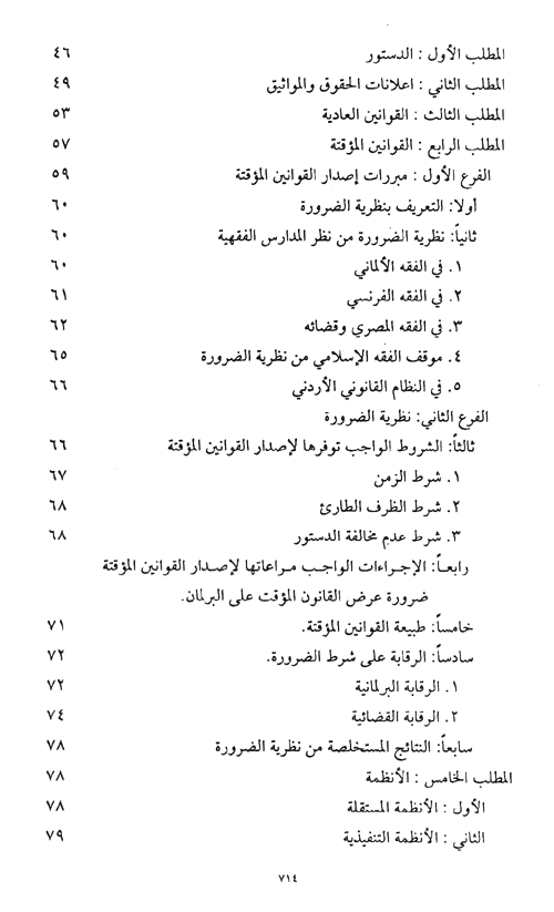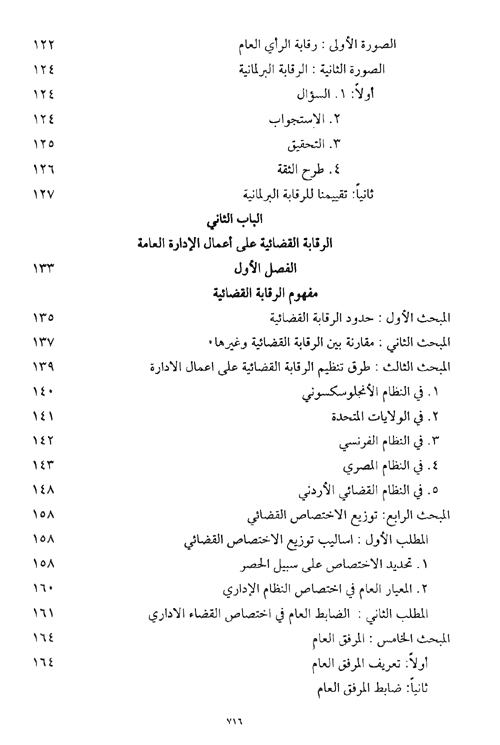 في الباب الأول: تناول الأساس القانوني للرقابة القضائية، مستعرضاً القانون الإداري من حيث طبيعته وتعريفه ومراحل تطوره وعلاقته بالقوانين الأخرى ومبدأ المشروعية ومصادرها ونظرية الضرورة والرقابة عليها ونظرية أعمال السيادة من حيث نشأتها ومبررات وجودها وضمانات تحقيق مبدأ المشروعية.