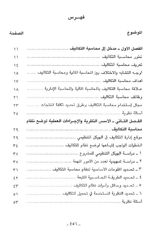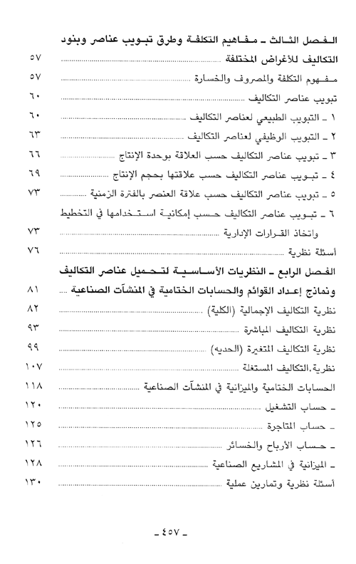 الفصل الخامس: الرقابة والمحاسبة عن تكلفة المستلزمات السلعية، ويتناول أهمية المواد والخامات بمفهومها الواسع في تكلفة المنتجات، والرقابة على عمليات الشراء والاستلام والتخزين والصرف، وقياس تكلفة شراء المواد وتكلفة استخدامها بحسب الطرق الشائعة، مع التطرق إلى طريقة المخزون الصفري في منشآت الإنتاج الفوري، وأيضاً يتناول المعالجة المحاسبية والتسويات الجردية للمستلزمات السلعية. الفصل السادس: المحاسبة عن الأجور (تكلفة العمل): ويتطرق بشكل أساسي إلى مفهوم الأجور والدورة المستندية لها، وطرق دفع الأجور بشيء من التفصيل بالإضافة إلى المعالجة المحاسبية.