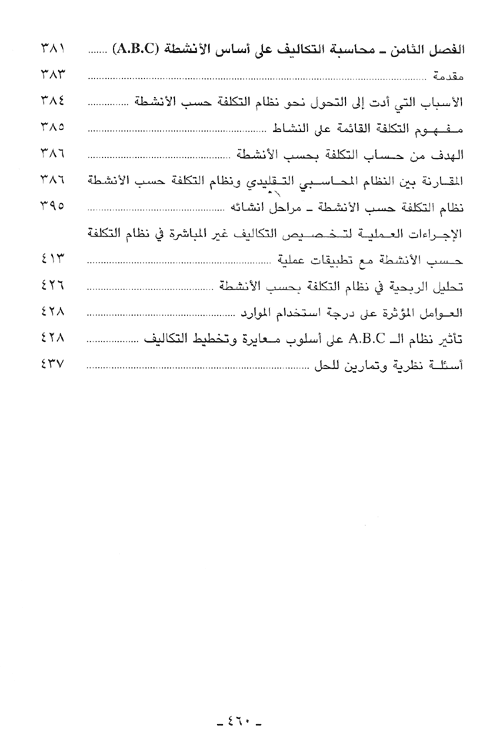 الفصل السابع: المحاسبة عن التكاليف الصناعية غير المباشرة: ويتناول مفهوم التكاليف الصناعية غير المباشرة وكيفية تصنيف عناصرها والأسلوب العلمي لحصر وتحديد وتوزيع وتحميل التكاليف الصناعية غير المباشرة على الوحدات المنتجة، والمعالجة المحاسبية لها. الفصل الثامن: محاسبة التكاليف على أساس الأنشطة: ويتطرق إلى الأسباب التي أدن إلى التحول نحو نظام التكاليف بحسب الأنشطة، و مفهوم التكلفة بحسب الأنشطة ومراحل إنشاء نظام التكلفة حسب الأنشطة، والإجراءات العملية لتخصيص الأعباء غير المباشرة، وتحليل الربحية، وتأثير نظام الـ A.B.C على أسلوب معايرة وتخطيط التكاليف، مع تطبيقات عملية محلولة وغير محلولة. إقرأ المزيد