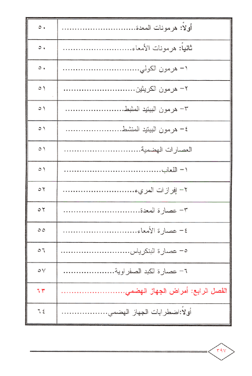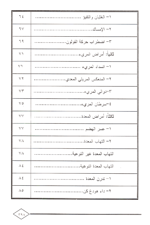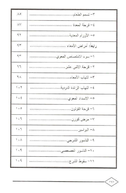 أما الفصل الرابع: فكان لأمراض الجهاز الهضمي متمثلاً في اضطربات الجهاز الهضمي. أما الفصل الخامس: فكان لأورام الأمعاء والسادس لأمراض ملحقات الأمعاء. أما الفصل السابع فقد تحدث فيه عن الجهاز التنفسي. أما الفصل الثامن: فقد أفرده لأمراض الجهاز التنفسي كأمراض الرئة. وتحدث في الفصل التاسع: عن جهاز الدوران. أما الفصل العاشر: فقد كان للأوعية الدموية متمثلاً في الشرايين. أما الفصل الحادي عشر: فخصصناه للقلب وأمراضه. والفصل الثاني عشر: كان لشرايين الدورة الجهازية والثالث عشر لأوردة الدورة الجهازية. والفصل الرابع عشر: فقد كان للدم. أما الفصل الخامس عشر: فقد أفرده لأمراض جهاز الدوران. والفصل السادس عشر: لأمراض الجهاز القلبي والوعائي. والفصل السابع عشر: لأمراض الأوعية الدموية. والفصل الثامن عشر: للجهاز الليمفاوي. والفصل التاسع عشر: فقد كان لأمراض الدم والعقد الليمفاوية. إقرأ المزيد