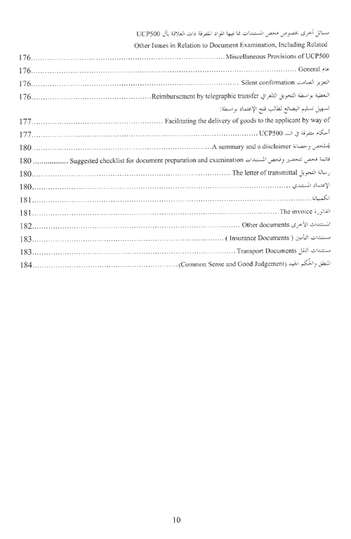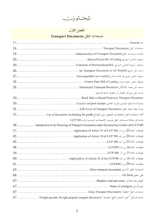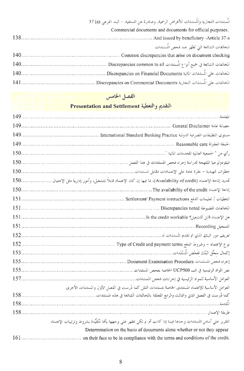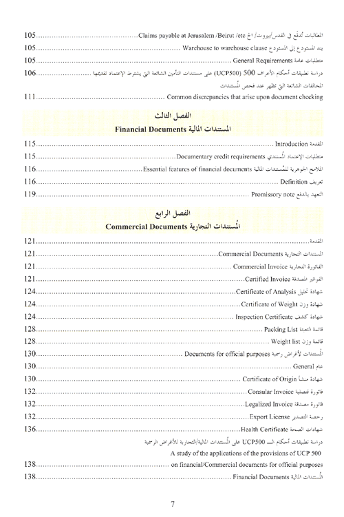 وعرض في الفصل الثالث للمستندات المالية مثل السحب أو التعهد بالدفع وهي مستندات قانونية تثبت المطالبات بالمبالغ المستدانة. وفي الفصل الرابع عرض المؤلف للمستندات التجارية، ومن الذي يصدرها ومحتويات المستند والهدف الذي صدرت لأجله. أما الفصل الخامس والأخير فخصصه لتعليم أخصائيي الاعتمادات المستندية كيفية فحص المستندات وإتباع الإجراءات الصحيحة في عمليات الفحص كما خصصه لتمكينهم من فهم مواد الـ ucp المتعلقة بفحص المستندات. إقرأ المزيد