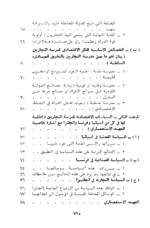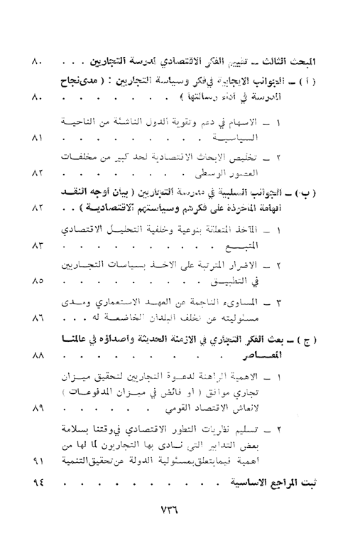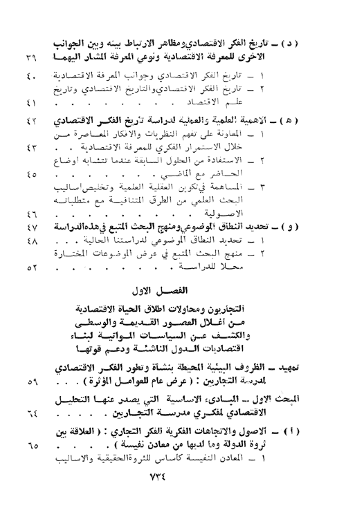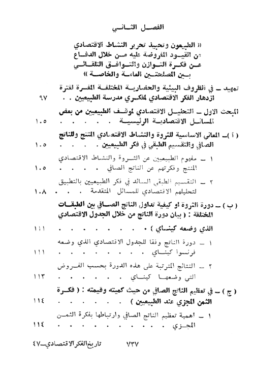 أما في الفصل الثاني فهو يقدم للطبيعيين والظروف البيئة والحضارية المختلفة المفسرة لفترة ازدهار الفكر الاقتصادي عند مفكري هذه المدرسة كما يمهد لذلك بتحديد المرحلة التاريخية التي انتشر فيها الفكر الطبيعي والمبادئ العامة التي يصدر عنها معتنقوه في تفكيرهم. كما بحث في الفصل الثالث التقليديين وإرساء قوائم الفكر التقليدي عن الحرية الاقتصادية والظروف البيئية المؤثرة في نشأة وتطور الفكر الاقتصادي لمدرسة التقليديين والعناصر العامة لفلسفة آدم سميث وقواعد السياسة الاقتصادية المستمدة منها.