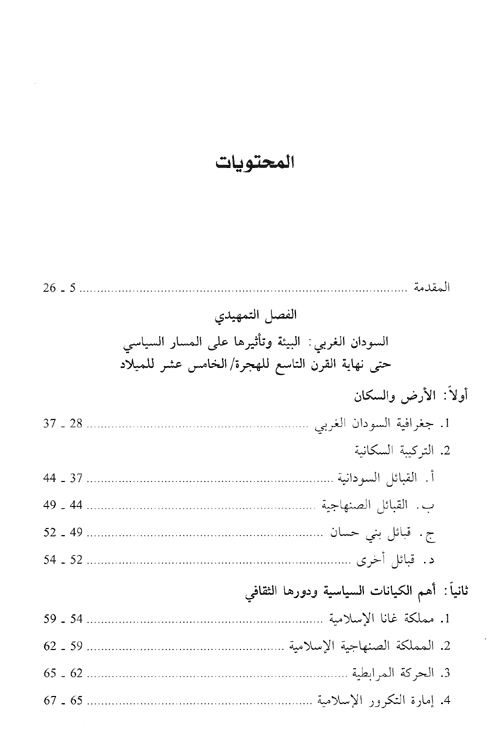 وبالعودة لفهرس هذه الدراسة نجد أنه قد جاء مقسماً إلى مقدمة وتمهيد وستة فصول وخاتمة. أما التمهيد وهو بعنوان : "السودان الغربي: البيئة وتأثيرها على المسار السياسي والثقافي حتى نهاية القرن التاسع للهجرة/ الخامس عشر للميلاد"، فسيعطي الباحث فيه -بادئ ذي بدء- لمحة عن العوامل الجغرافية التي أثرت في تاريخ المنطقة التي يشملها مصطلح بلاد السودان الغربي ومن بينها البيئة الطبيعية والبيئة السكانية والأجناس المختلفة التي عاشت وتفاعلت فيها ثقافياً.