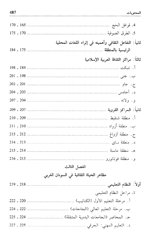 ويستعرض الباحث في الفصل الثالث وهو بعنوان: "مظاهر الثقافة العربية الإسلامية في السودان الغربي" أهم هذه المظاهر وهي التي تجسدت في النظام التعليمي الذي كان سائداً، ومراحله التي من أبرزها: مرحلة التعليم الأولى (الكتاتيب)، مرحلة التعليم العالي (الجامعات)، المحاضر (الجامعات البدوية المتنقلة)، وأخيراً التعليم المهني (الحرفي). كما يستعرض -أيضاً- المواد الدراسية والمقررات والإجازات العلمية والكتب والمكتبات وأخيراً يتطلع الباحث في هذا الفصل المعني لإعطاء تقييم علمي لدور الثقافة العربية الإسلامية في تطور حركة التأليف وانتقال أعلام هذه المنطقة من مرحلة التلقي إلى ما يمكن أن نسميه مرحلة الإبداع والتأليف في جملة علوم منها: العلوم الشرعية والنقلية وعلوم اللغة العربية وآدابها والتاريخ والتراجم.