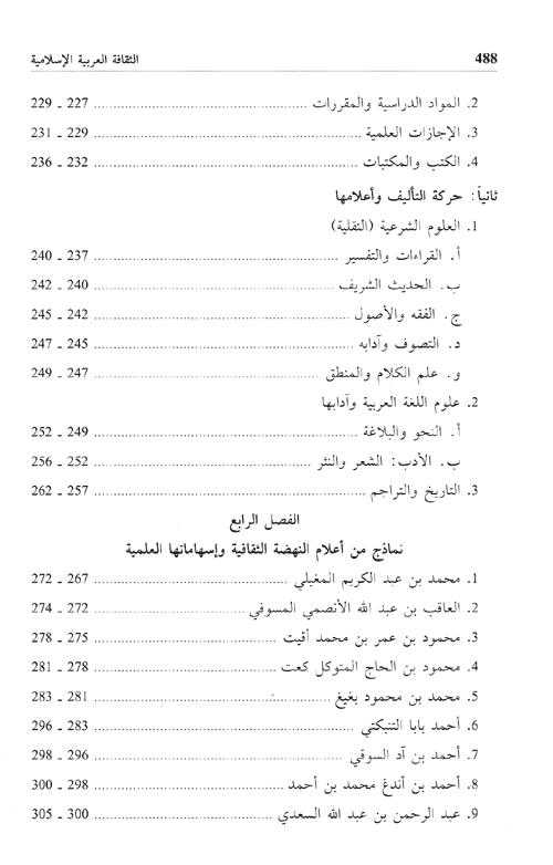 ويسعى الباحث في الفصل الرابع، وهو بعنوان: "نماذج من أعلام الثقافة العربية الإسلامية وإسهاماتها العلمية" إلى دراسة نماذج هامة لبعض أعلام الثقافة الذين أدوا دوراً بارزاً في إثراء تطور الثقافة العربية الإسلامية في السودان الغربي، إما بإنتاجهم العلمي وفتاواهم وإما بتسليط الضوء على أحوال البلاد المختلفة، فضلاً عن مساهماتهم في مجالات متنوعة أخرى كما أن هذا الفصل يهتم بدراسة السيرة الذاتية لهؤلاء الأعلام لمعرفة مدى انعكاساتها على منطقة الدراسة.