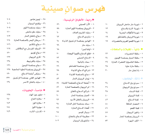 وبالنسبة لقسم الأطباق الرئيسية فقد تضمن وصفات لأطباق شهية نذكر منها: الأرز الصيني، ستيك المشروف الجاف، شاومين الدجاج، الدجاج الصيني، أجنحة الدجاج بالصلصة اللذيذة، السمك المقرقش مع البطاطس، دجاج كومبو، كاري الروبيان، ستيكس أجنحة الدجاج، أفخاذ الدجاج الحارة، دجاج بالكاجو... وهكذا. وقد شكلت وصفات هذا القسم جزءاً واسعاً من هذا الكتاب. وأخيراً فإن قسم الحلويات احتوى على الوصفات اللذيذة التالية: حلوى جوز الهندن حلاوة التفاح، حلاوة الموز، مهلبية اللوز، كاسترد التارت، كل تلك على الطريقة الصينية، كي يتعرف أهل البلاد العربية بصورة خاصة، وغيرهم بصورة عامة على مذاق الأطباق الصينية الشهية. والتي بإمكانهم تحضيرها بسهولة من خلال تتبع الطريقة المذكورة لكل صنف من الأصناف الواردة في هذا الكتاب، والمرفقة مع الصور الفوتوغرافية الموضحة لشكل كل طبق. إقرأ المزيد