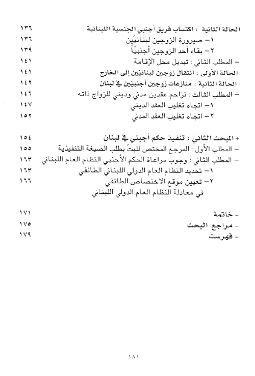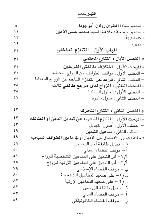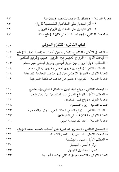 ونجح المؤلف في إبراز مختلف الافتراضات التي تولدها الإشكالية وألقى الأضواء على الاحتمالات الأكثر شيوعاً وصعوبة في آن. فبعد تمهيد لدراسته تناول فيه عرض الموضوع والتعددية التشريعية والقضائية، في جذورها ومراحل تطورها وتلازمها في الاختصاص الطائفي، حاول إثارة الإشكاليات المفترضة والعمل على معالجتها وإبراز الحلول لها وذلك على الصعيد الداخلي، في باب أول، وعلى الصعيد الدولي في باب ثان، مستنداً إلى مراجع قانونية ومؤلفات متنوعة مضموناً ولغة.نبذة الناشر:"إن هذا الكتاب هو المؤلف الأول الذي تضمن دراسة شاملة ووافية في شأن تنازع المحاكم والقوانين في لبنان في مادة الزواج، حتى ليصح بأنه عمل تأسيسي يمكن البناء عليه ومرجع يجدر الركون إليه.