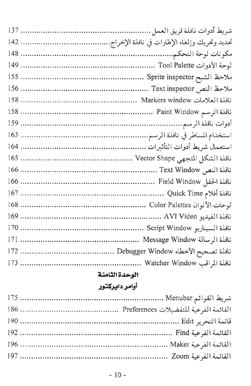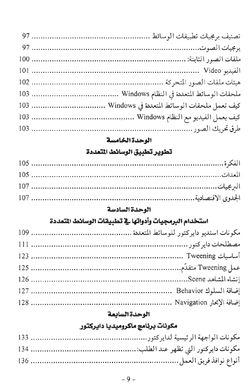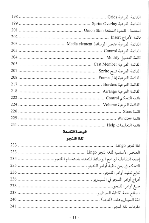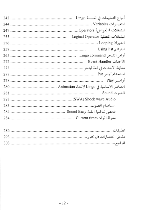 ثم اتبع ذلك بالمهام الأساسية في التعامل مع مكونات دايركتور وكيفية إضافة التفاعل وتحرير الوسائط وتجميع المشاهد وإخراج البرنامج وقد تضمن الحديث وبشكل خاص عن لغة لنجو والتي هي لغة برمجة دايركتور.