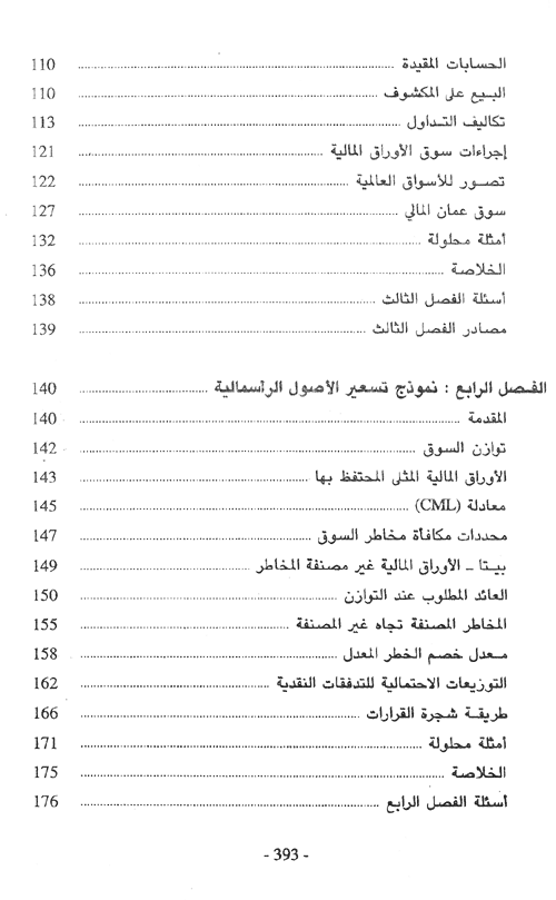 وتناول الفصل الرابع نموذج تسعير الأصول الرأسمالية، حيث تمت الإشارة في هذا الفصل إلى رسملة السوق للملكية في السوق وكيفية استخدام بعض المؤشرات التي هيمن على الأسواق المالية استخدام بعضها مثل (S&P500) ومؤشر (ولشر 5000) (ومؤشر رسل 3000). وفي هذا الفصل تم التوسع في الإشارة إلى المحفظة المثلى ذات المخاطر القليلة وإذا كان جميع المستثمرين يفضلون المحافظ المثلى فكيف يؤثر ذلك على توازن أسعار الأوراق المالية والعوائد المتوقعة.