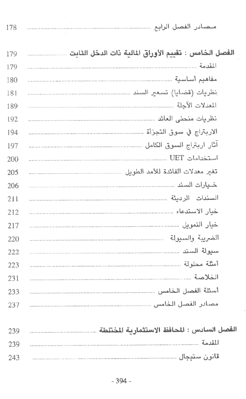 وتقييم الأوراق المالية ذات الدخل الثابت فهو موضوع الفصل الخامس. وقد تناول هذا الفصل إعطاء فكرة عامة لمحددات قيم سوق السندات من خلال دراسة المبادئ الهامة في تقييم السند.