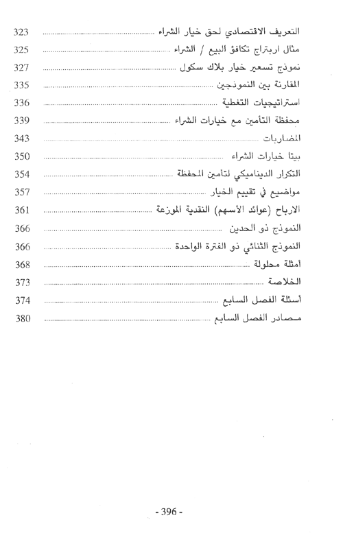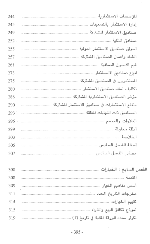 أما الفصل السابع والأخير فيتناول موضوع الخيارات الذي يعتبر من مواضيع استثمار المهمة، فمن الصعوبة بمكان تحقيق الفهم الكامل عن أنواع الأوراق المالية من حيث تقييمها وإدارتها دون فهم لبعض أساسيات الاستثمار مثل التنويع ونظرية المحفظة أو تسعير الأوراق المالية. ويعطي هذا الفصل فكرة واضحة عن كيفية تحديد أسعار السوق لخيارات البيع والشراء وكيفية استخدام هذه الخيارات في حماية (تغطية) المحفظة الاستثمارية واستراتيجيات المضاربة. إقرأ المزيد