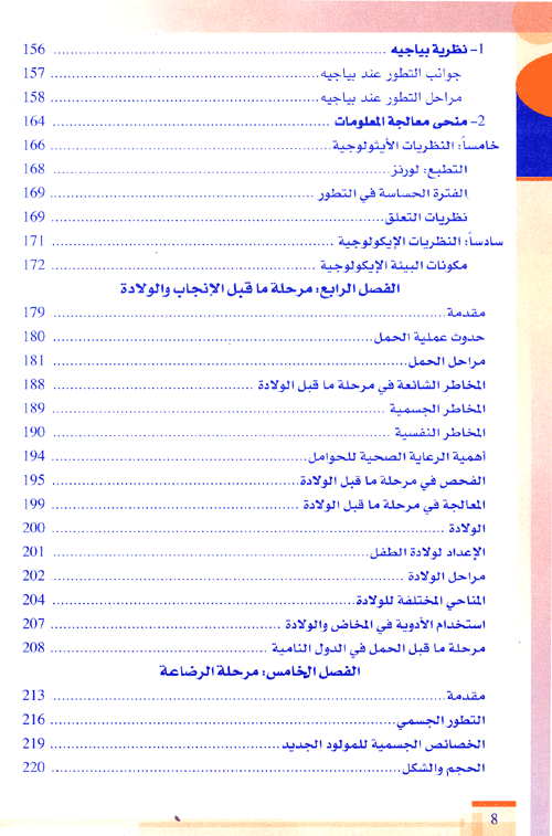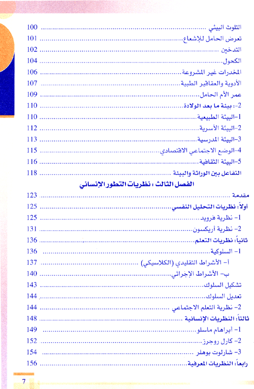 أما الفصل الثالث فقد تناول نظريات التطور الإنساني حيث تم التعريف بنظريات التحليل النفسي ونظريات التعلم والنظريات الإنسانية والمعرفية والإيثولوجية وألإيكولوجية. وتناول الفصل الرابع مرحلة ما قبل الإنجاب والولادة، وعلى وجه الخصوص الحمل ومراحله والمخاطر الشائعة وأهمية الرعاية الصحية للأم الحامل, وركز الفصل الخامس على مرحلة الرضاعة والتغيرات الجسمية والمعرفية والانفعالية الاجتماعية والمشكلات ذات جوانب التطور فيها. أما الفصل السابع فقد تناول مرحلة الطفولة المتوسطة والمتأخرة حيث تم تناول التطور الجسمي والمعرفي والانفعالي والاجتماعي مع التركيز على المشكلات التطورية المتوقعة في هذه المرحلة، وأخيراً تناول هذا الكتاب في فصله الثامن والأخير مرحلة المراهقة التي يتزايد الاهتمام بها في المجتمعات العربية التي يشكل المراهقون فيها نسبة كبيرة، وكما هو الحال بالنسبة للمراحل الأخرى فقد تناول هذا الفصل النواحي الجسمية والمعرفية والانفعالية والاجتماعية وبعض المشكلات ذات العلاقة بهذه الجوانب. إقرأ المزيد