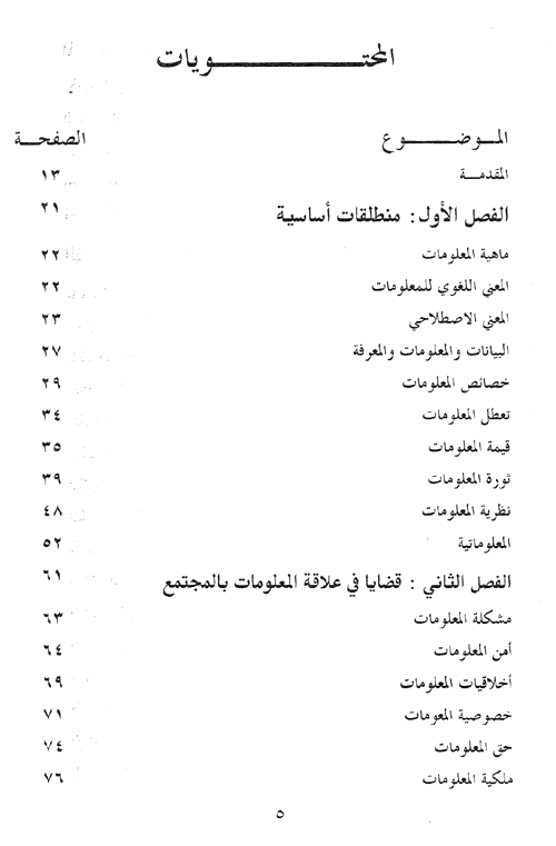 يتكون الكتاب من ثمانية فصول، يتناول الفصل الأول منطلقات أسياسية شملت ماهية المعلومات، البيانات، والمعلومات والمعرفة، خصائص المعلومات، تعطل المعلومات، قيمة المعلومات، نظرية المعلومات، والمعلوماتية. أما الفصل ...الثاني فقد تناول قضايا مشكلة المعلومات، أمن المعلومات، أخلاقيات المعلومات، وقضايا تتعلق بعلاقة المعلومات بالمجتمع.