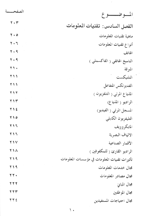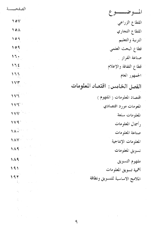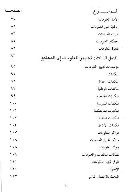 وفي الفصل الخامس تكلمنا عن اقتصاد المعلومات وقد تضمن ذلك مفهوم اقتصاد المعلومات، المعلومات كمورد اقتصادي، والمعلومات سلعة، ورأس مال المعلومات وصناعة المعلومات، والمعلومات والإنتاجية، وتسويق المعلومات. ويبحث الفصل السادس في تقنيات المعلومات، فيعرف بهذه التقنيات وأنواعها، وتأثيراتها في مؤسسات المعلومات، وفي المجتمع. أما الفصل السابع فقد تناول الإنترنت والمجتمع من حيث أدوات الإنترنت، ومجالات الإفادة والتسهيلات التي تقدمها إلى المجتمع، بالإضافة إلى التأثيرات الإيجابية والسلبية للإنترنت في المجتمع.