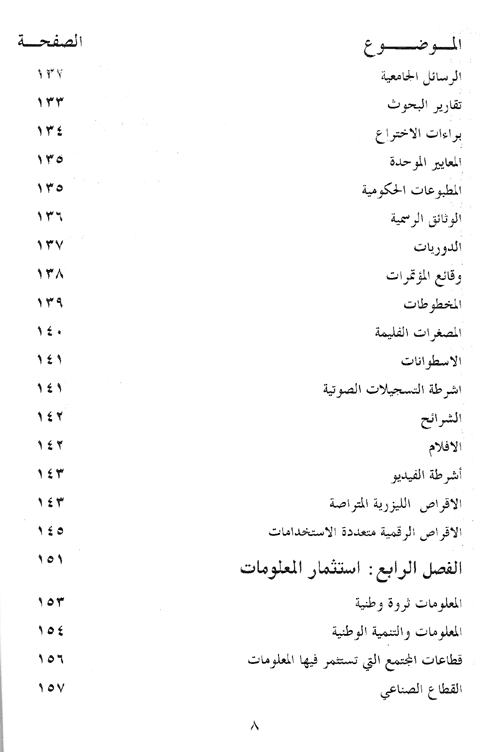 ويبحث الفصل الثالث في الموضوع تجهيز المعلومات إلى المجتمع، فيسلط الضوء على المؤسسات التي تقوم بتجهيز المعلومات إلى المجتمع وطرق تجهيز المعلومات والأوعية التي تجهز بها. أما الفصل الرابع فإنه يتناول قضية استثمار المعلومات كونها ثروة وطنية ويتطرق إلى قطاعات المجتمع التي تستثمر المعلومات وهي القطاع الصناعي، والزراعي، والتجاري، وقطاع التربية والتعليم والبحث العلمي والثقافة والإعلام، وصناعة القرارات ثم الجمهور العام.