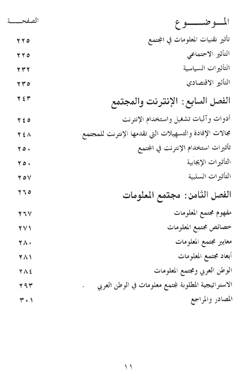 وأخيراً تكلم الفصل الثامن عن مجتمع كونه المجتمع الذي تعمل دول العالم على التحول إليه، فبين هذا الفصل مفهوم مجتمع المعلومات وخصائصه، ومعاييره، وأبعاده، ثم بين الاستراتيجية المطلوبة لمجتمع معلومات في الوطن العربي.