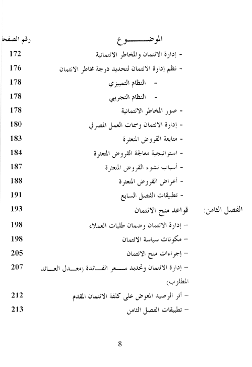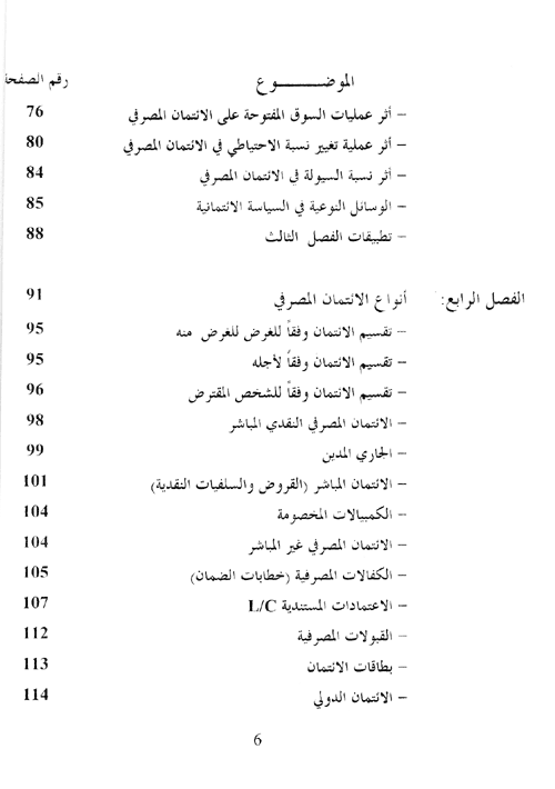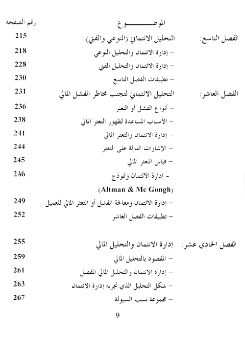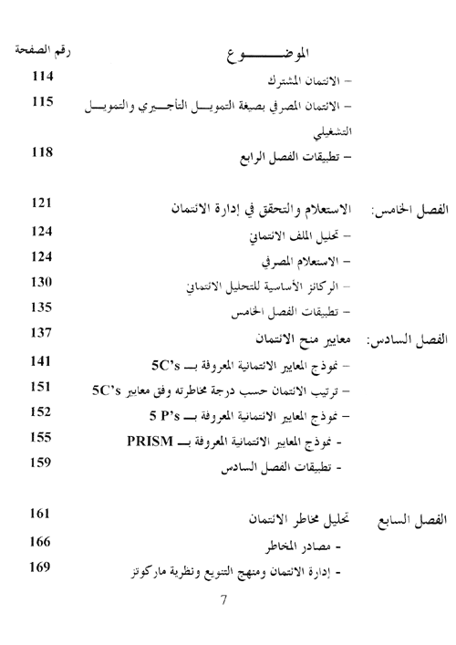 وهذه الفصول هي: الفصل الأول: الائتمان المصرفي، ماهيته وأهميته. الفصل الثاني: خلق الائتمان المصرفي. الفصل الثالث: تنظيم الائتمان المصرفي والرقابة عليه. الفصل الرابع: أنواع الائتمان المصرفي. الفصل الخامس: الاستعلام والتحقق في إدارة الائتمان. الفصل السادس: معايير منح الائتمان المصرفي. الفصل السابع: تحليل مخاطر الائتمان المصرفي. الفصل الثامن: قواعد منح الائتمان المصرفي. الفصل التاسع: التحليل الائتماني (النوعي والفني). الفصل العاشر: التحليل الائتماني لتجنب مخاطر الفشل. الفصل الحادي عشر: إدارة الائتمان والتحليل المالي. الفصل الثاني عشر: إدارة الائتمان واحتياجات العميل والنمو القابل للاستمرار.