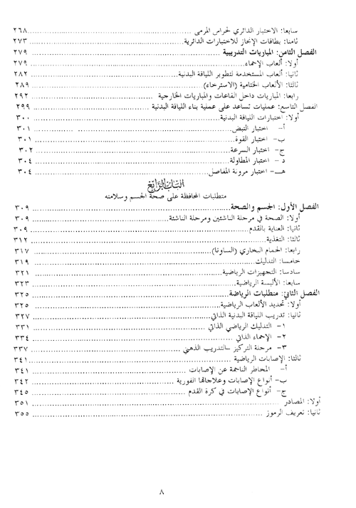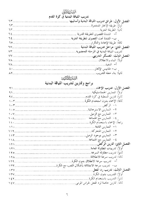 وشمل الباب الثاني على تدريبات اللياقة البدنية في كرة القدم، إذ تناول أساليب تدريب اللياقة البدنية ومراحلها. ...أما الباب الثالث فقد اشتمل على برامج وتمارين تدريب اللياقة البدنية في كرة القدم، مبتدئاً بالتدريب على الإحماء والتمارين المستخدمة لذلك وتمارين الركض ورد الفعل والتوافق وتمارين القوة في الملعب وأساليب التدريب الدائري وانتهاءً بالمباريات التدريبية من أجل تحسين مستوى اللاعبين، والأساليب التي تساعد في علمية بناء اللياقة البدنية للاعب كرة القدم بمختلف مستوياته. وتناول الباب الرابع متطلبات المحافظة على صحة الجسم وسلامته.