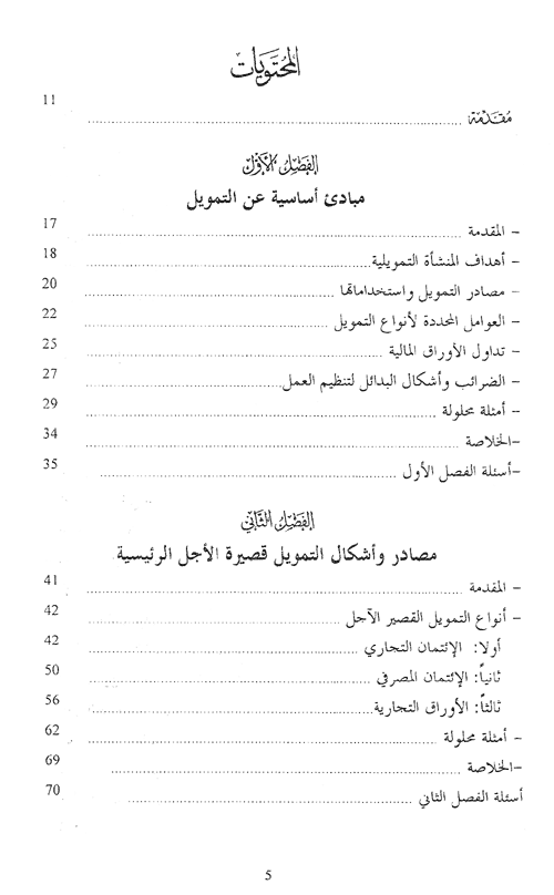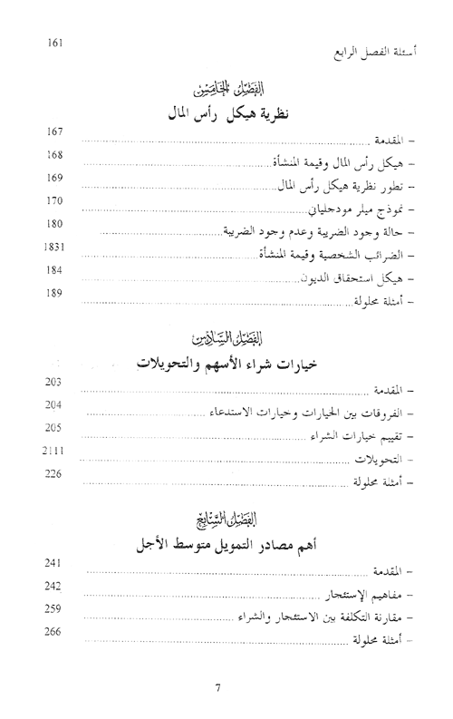 أما الفصل السادس فيتناول بعض الأنواع من الأدوات المالية التي تصدرها المنشأة كوسيلة للتمويل مثل الخيارات options وحقوق الاكتتاب باسهم Rights. كذلك يسلط الضوء على السندات القابلة للتمويل ويبين الفصل السابع أهم مصادر التمويل وأدوات التمويل التي يمكن للمنشأة استخدامها وخصوصاً مصادر التمويل المتوسطة الأجل.