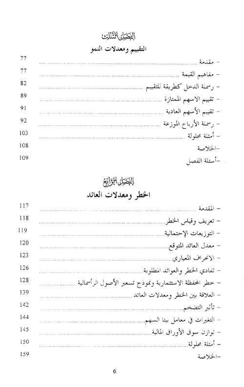ويعالج الفصل الثالث طرق تقييم السندات والأسهم ويتطرق أولاً لمفاهيم القيمة. ويعالج الفصل الرابع حالات اتخاذ القرار في ظل درجات متفاوتة من المعلومات المتوفرة وتعريف الخطر وطرق قياسه. أما الفصل الخامس فيتناول مجال الضرائب حيث تلعب الدولة دور متزايد في مجال إدارة الأعمال والفعل هو مختصر لتركيبه الضريبة وعلاقتها بالقرارات المالية.