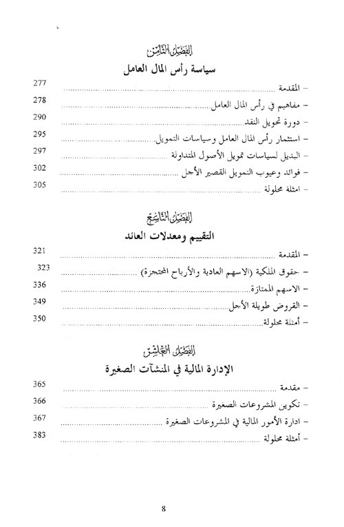 يتناول الفصل الثامن السياسات والقرارات المرتبطة بإدارة الموجودات المتداولة والمطلوبات المتداولة وما تتضمنه إدارة رأس المال العامل من قرارات. ويتطرق الفصل التاسع إلى الوسائل التي تمارسها المنشأة في الحصول على التمويل الطويل الأجل في الأسواق الرأسمالية Capital Markets. وقد خصص الفصل العاشر لإلقاء الضوء على الشبه أو الاختلاف للإدارة التمويلية في المشروعات الصغيرة حيث يهيئ الفصل الفرصة لمراجعة بعض المفاهيم الرئيسية بهذا الخصوص.