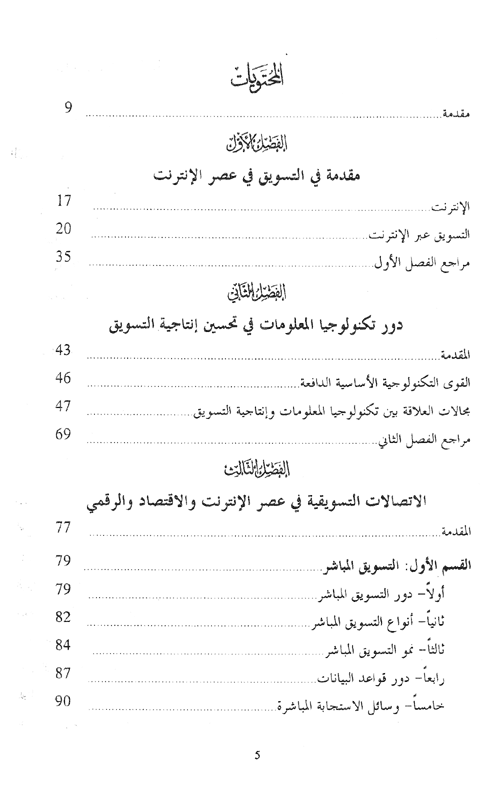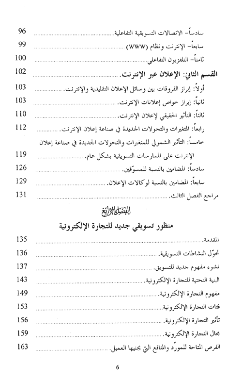 وقد جاءت لغة الكتاب مبسطة، لكن متعمقة، تتخللها أمثلة وشواهد ميدانية تضفي طابعاً عملياً وتطبيقياً على منهجية الكتاب. كما جاءت فصول الكتاب متكاملة وموحدة في الاتجاه القائل بأن المعلومات اليوم أصبحت تتبوأ موقعاً رفيعاً باعتبارها تشكل واحداً من أهم عناصر تكوين الثروة.نبذة الناشر:يبحث هذا الكتاب في كيفية أستخدام تقنية وطاقات الأنترنت الهائلة لتحسين الكفاءة والفاعلية التسويقية في عصر الأقتصاد الرقمي الذي يتسم بالديناميكية العاليو واللامحدودية في أختراق الأسواق التنافسية وصولا لهدف أشباع حاجات ورغبات وتطلعات العملاء على أختلاف أنواعهم ومسمياتهم وقد جاءت لغة هذا بسيطة لكن معمقة تتخللها أمثلة وشواهد ميدانية تطفي طابعا عمليا وتطبيقيا على منهجية الكتاب .