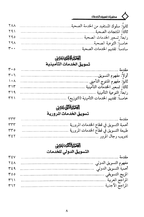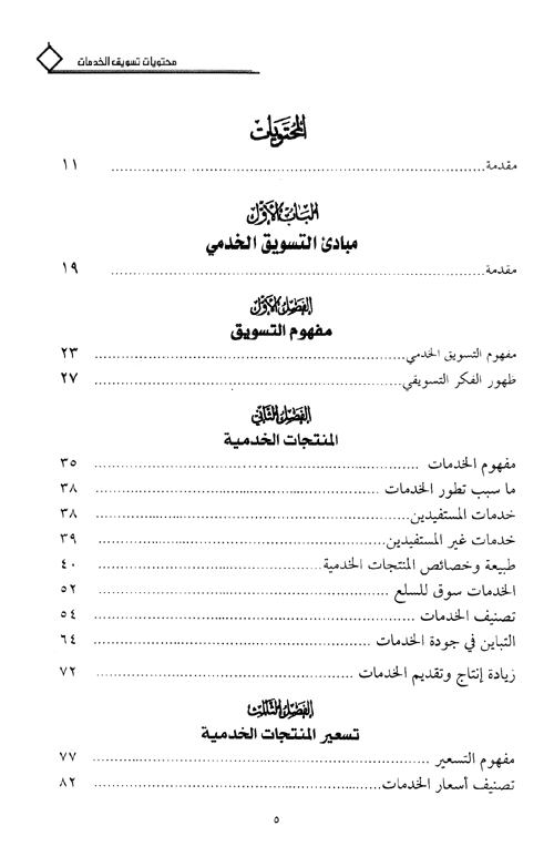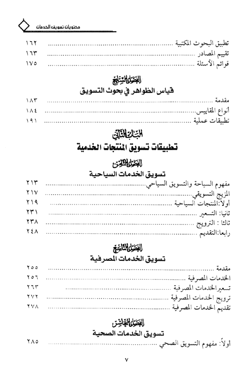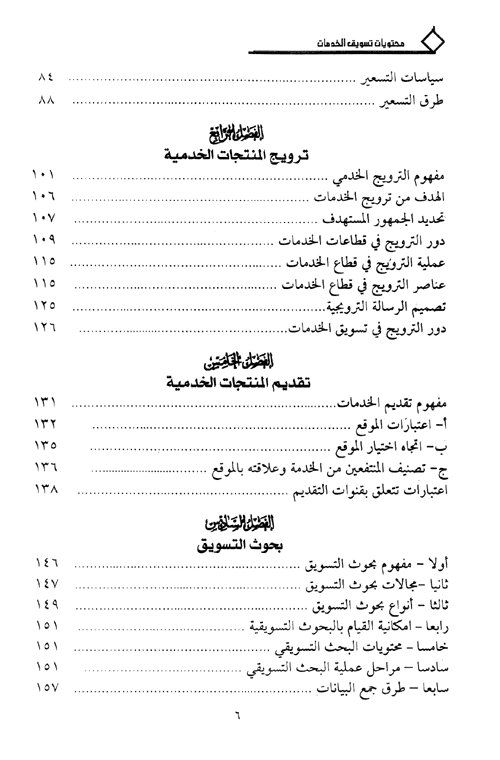 وركز الفصل الثالث على تسعير الخدمات والطرق المستخدمة فيه، أما ترويج الخدمات فقد تناوله في الفصل الرابع (أي استخدام الإعلان، والاتصال الشخصي، والتحفيز، والعلاقات العامة، والدعاية) في مجال إيصال المعلومات، أما العنصر الأخير من عناصر المزيج التسويقي فيتناول تقديم (توصل) الخدمات والأساليب المتبعة في ذلك، ولكي يتبين القارئ كيفية الحصول على المعلومات التي لا يختلف أسلوبها عن غيرها فقد ضمنه فصلين أحدهما بحوث التسويق والآخر قياس الظواهر في بحوث التسويق مستخدماً فيه أساليب رياضية لضمان دقة المعلومات التي يستخدمها المسوق في اتخاذ القرارات التسويقية.