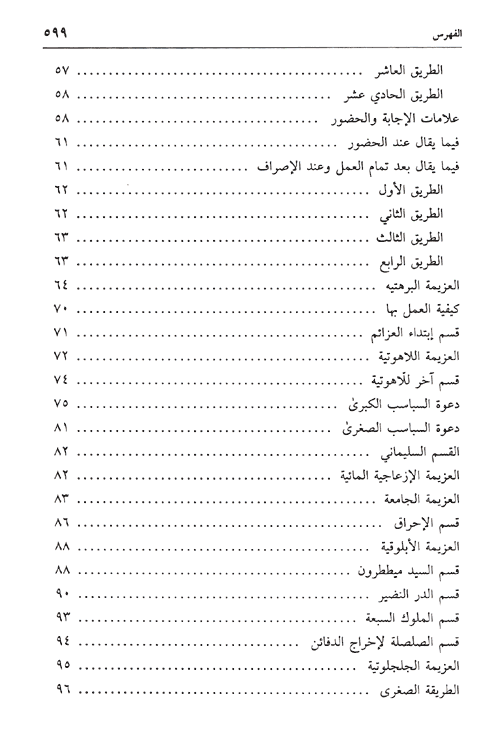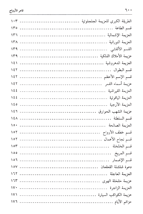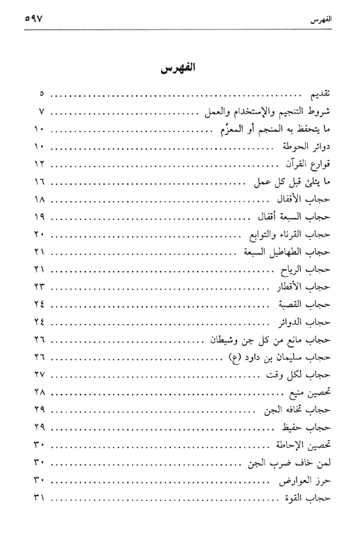 والكتاب في أقسام، قدم لها المؤلف بمقدمة عامة عن شروط التنجيم والاستخدام والعمل، ذاكراً ما يتلى قبل أن يتحدث عن كيفية عمل الأحجبة. كما أفرد أقساماً قسم منها للأسماء الروحانية النافعة وهو يحوي عدداً من العزائم، وقسم آخر لتسخير الكواكب والخواتم الطلسمية وفي كيفية عن الخواتم، واستخدام ملوك الزمان واستخدام عامر المكان، وأعمال الجاه والقبول وقضاء الحوائج.